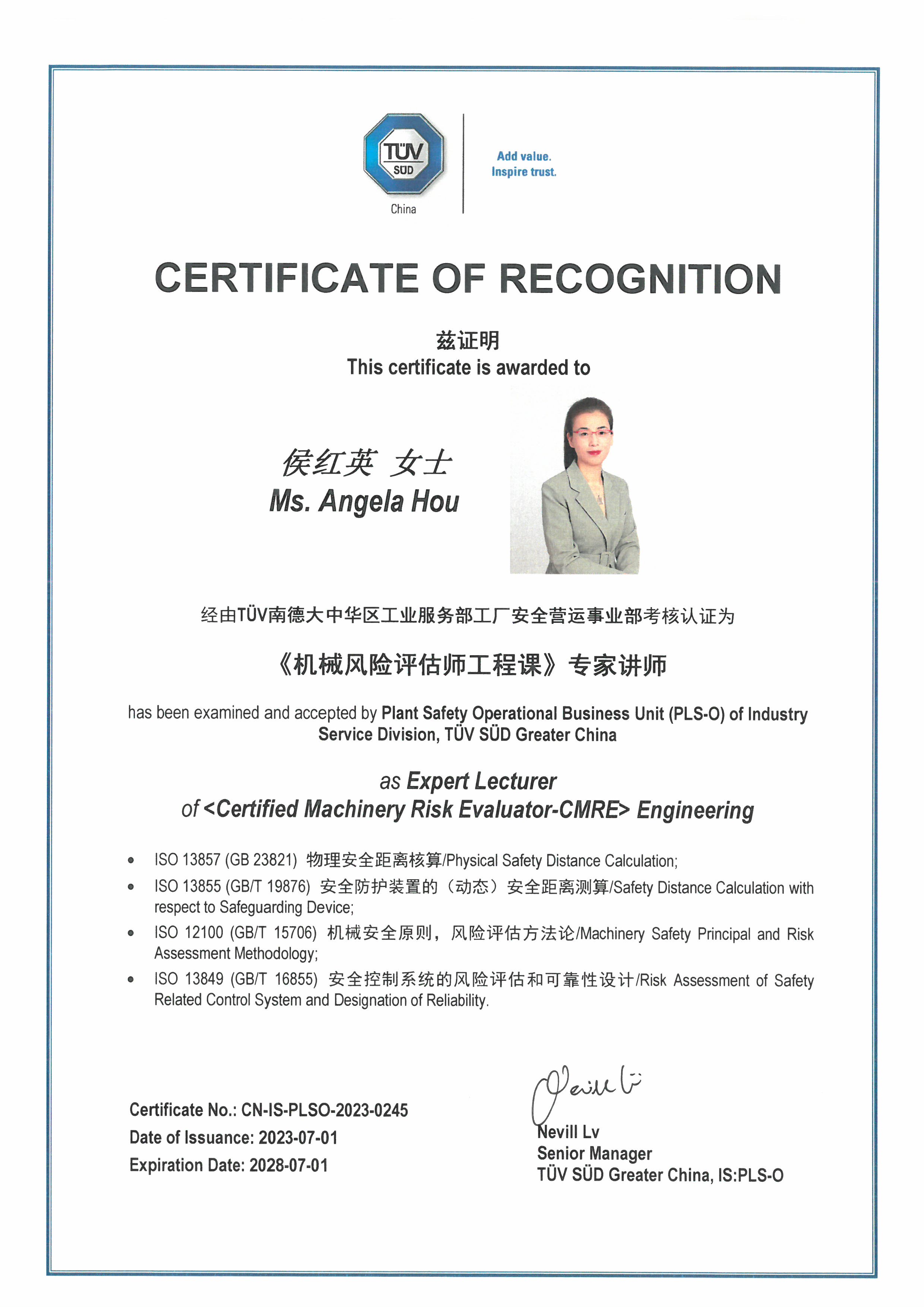 ISO國際標準 (機械安全)TC199/WG-6 Convenor 分組召集人;ISO國際標準 (機器人)TC299/WG-3 工業(yè)機器人安全標準專家。